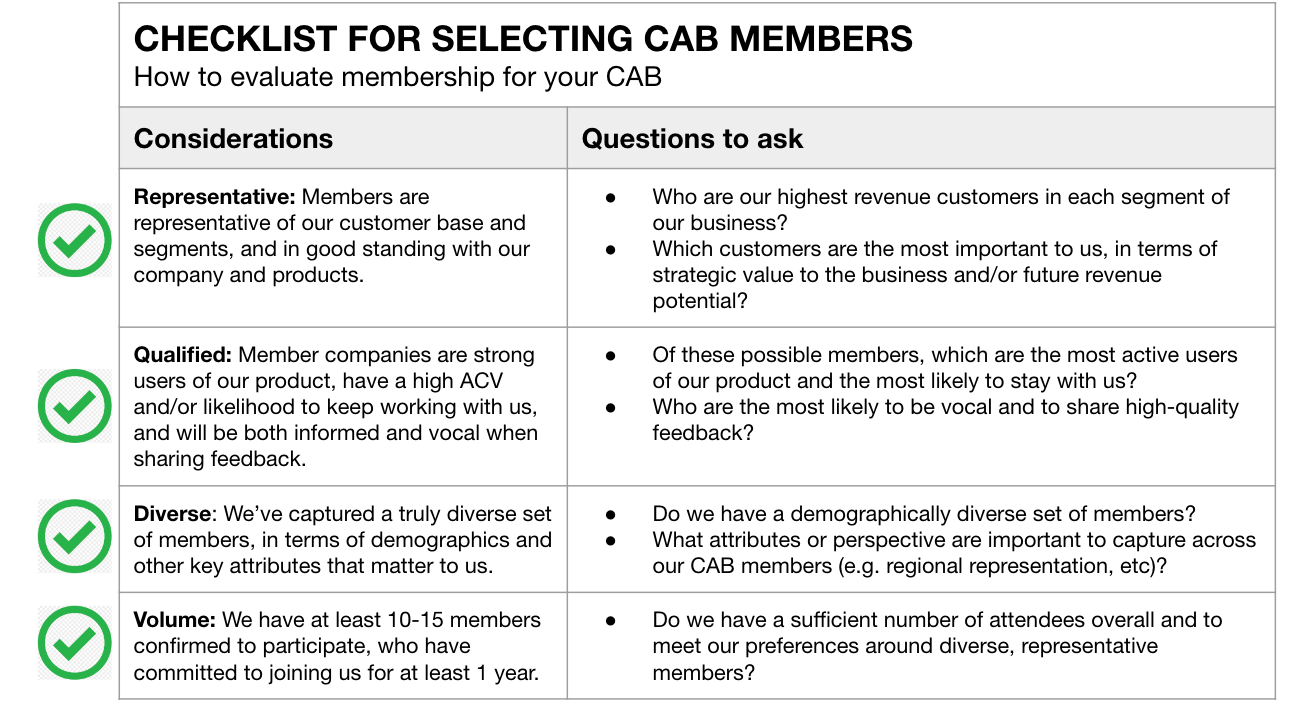 Don’t overthink the measure of success. The key point is to create clarity on your CAB’s purpose, giving you a north star for prioritizing attendees, agenda items, and even how you act on the feedback. For a CAB, it’s less important for the goal to be exactly measurable than for it to be useful.